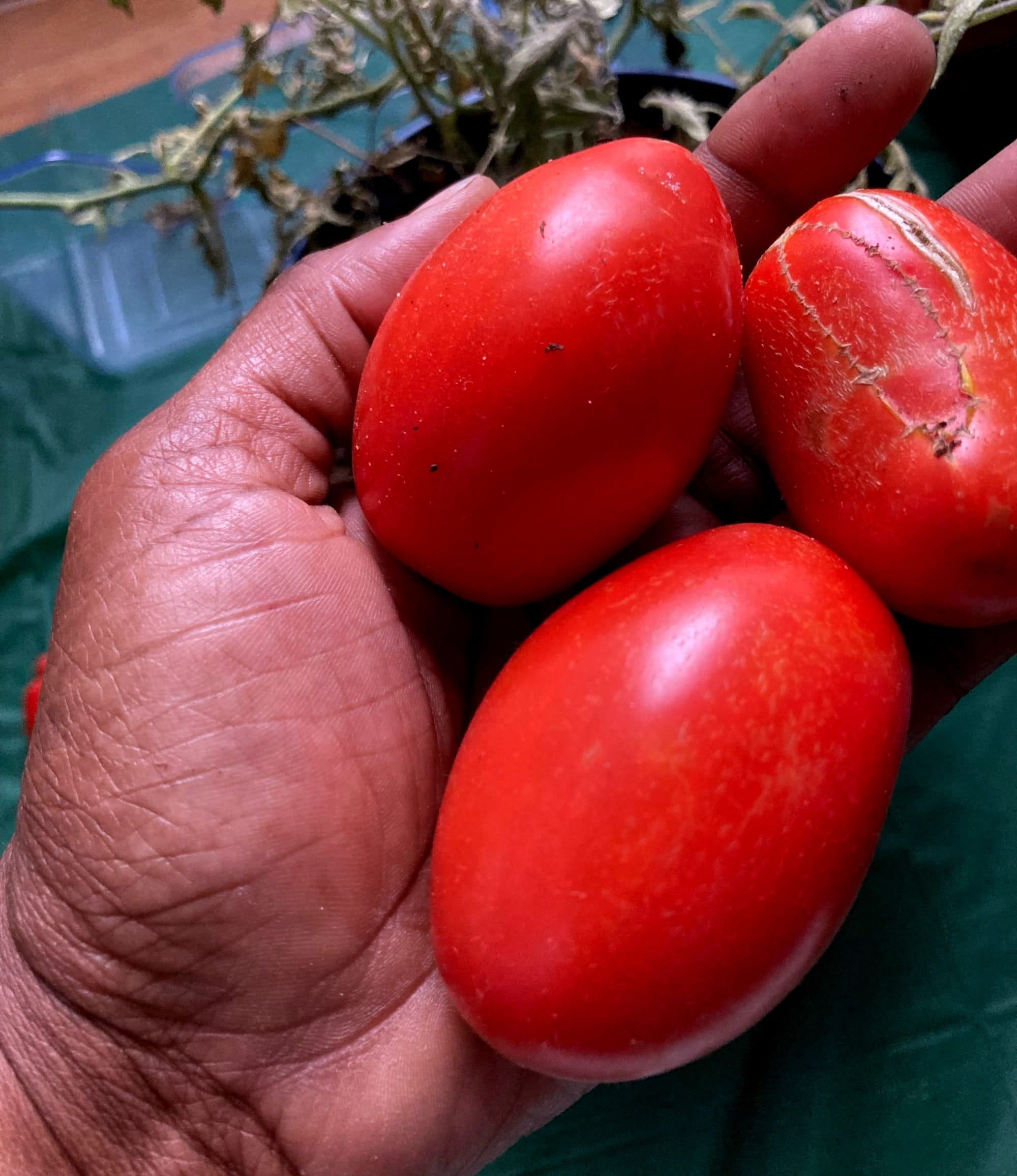 Then, I blanched the fresh tomatoes (I boiled some water in a sauce pan, then dropped the tomatoes into the boiling water for something like 45s to a couple of minutes, until the skin began to pull away. I took them out of the water with tongs, put them in an ice bath, then peeled the skin off).