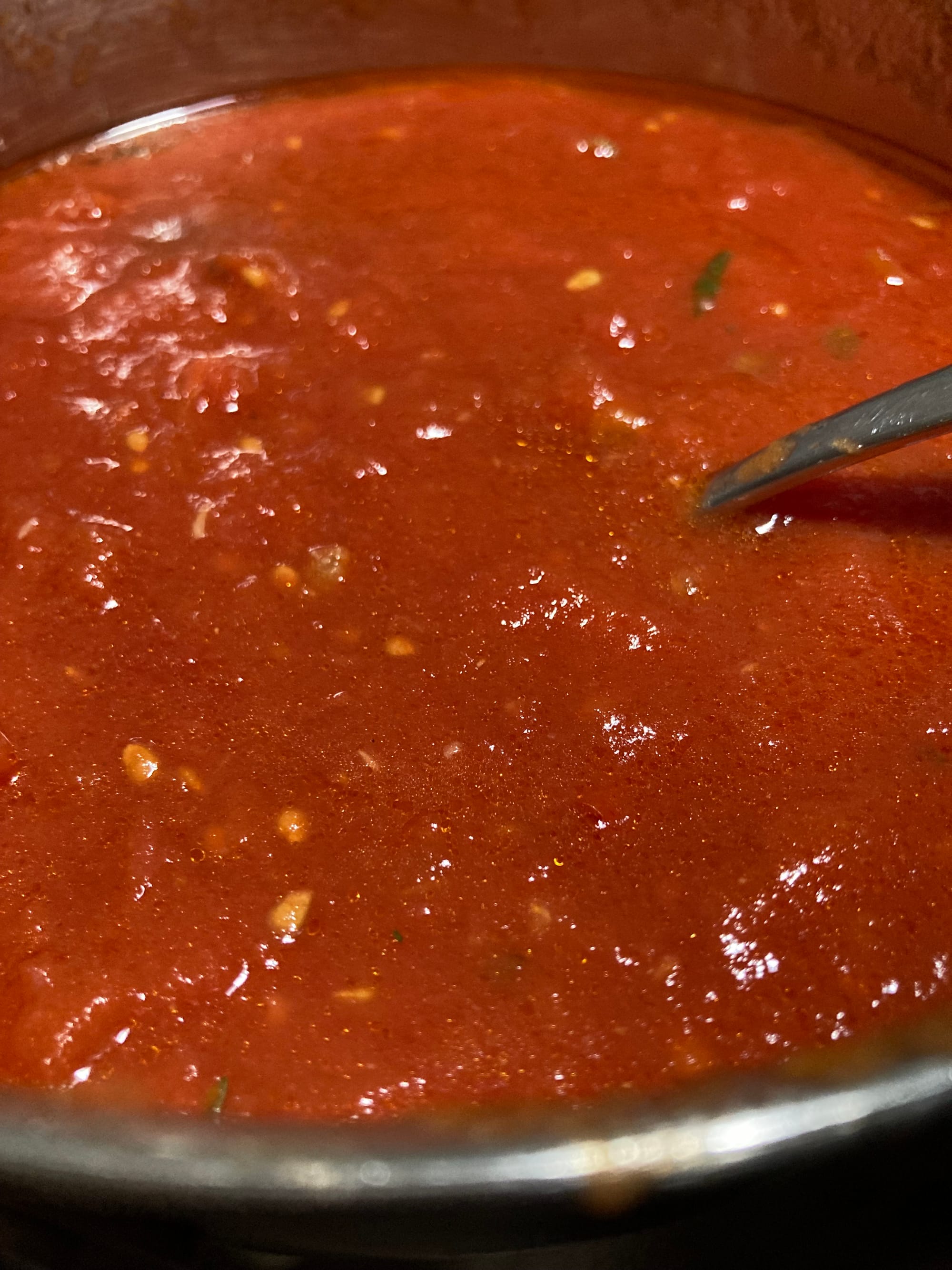 Right after that, I transferred all of tomato mixture into the saucepan, stirred stirred stirred, got it boiling for two seconds while stirring the whole time, then dropped the heat down to simmer. It simmered, covered, for about 40 minutes while I stirred thoroughly every five or seven minutes or so.