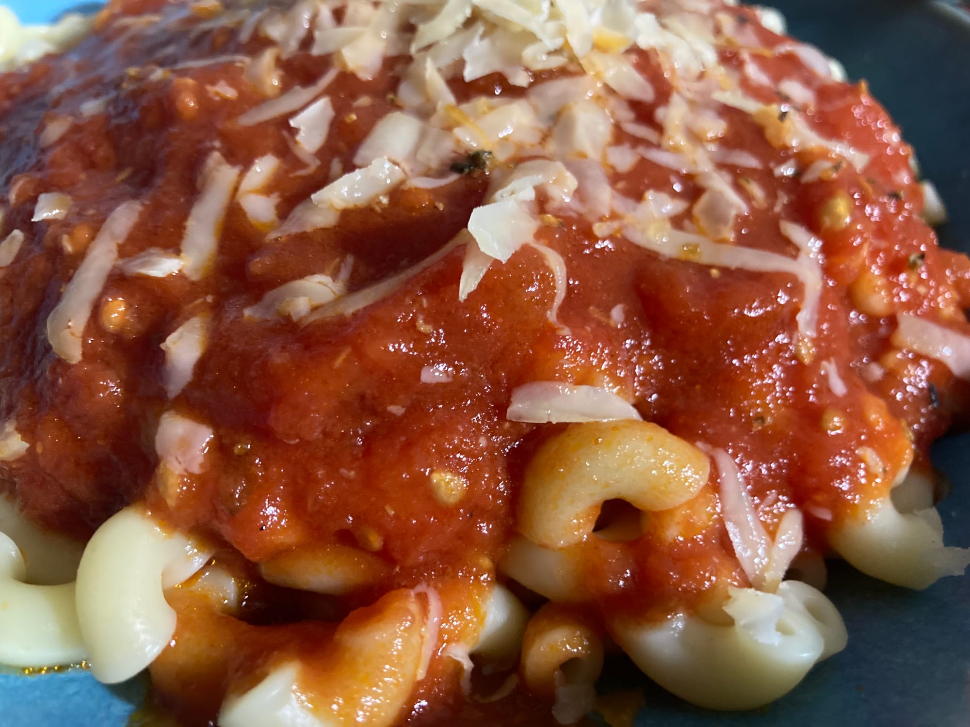 Meanwhile, I boiled the elbow macaroni as the instructions said, and when it was ready, I put the macaroni on the plate, then put the sauce atop it.