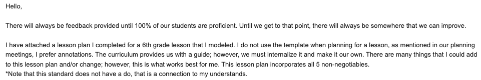 I then asked for a copy of a lesson plan that they deemed worthy of not needing notes. This was the response: